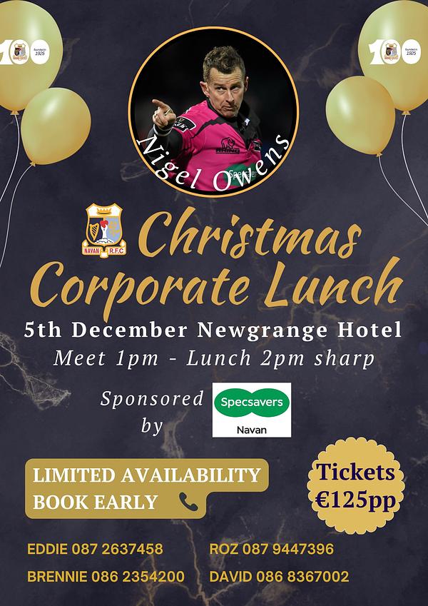With thanks to event sponsor Specsavers Navan, we are thrilled to announce that our special guest at this yearβs Navan RFC Christmas Corporate Lunch will be none other than: